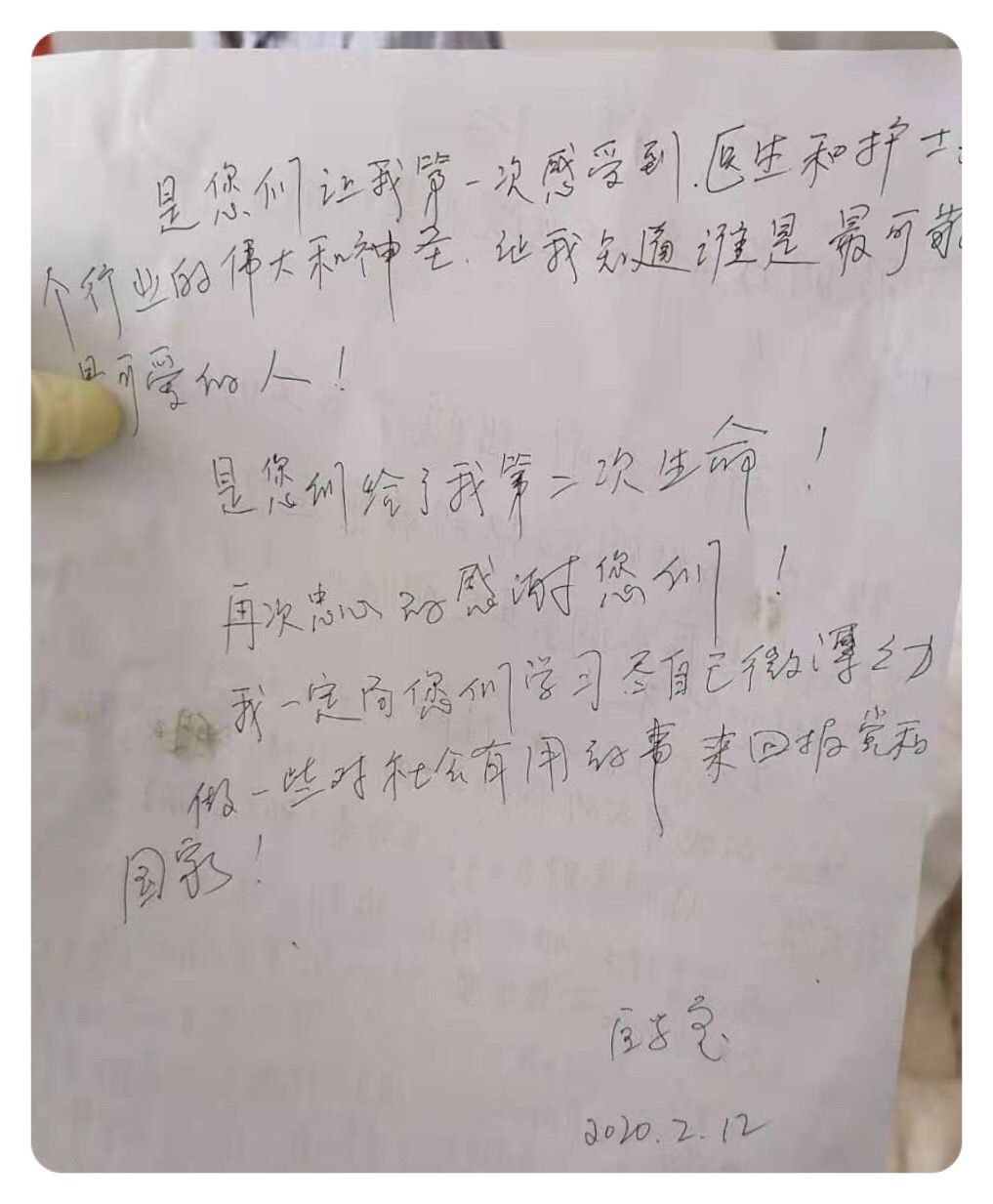 【疫情捷报】我市第二例新冠肺炎患者出院 患者手写感谢信致敬我院医务团队