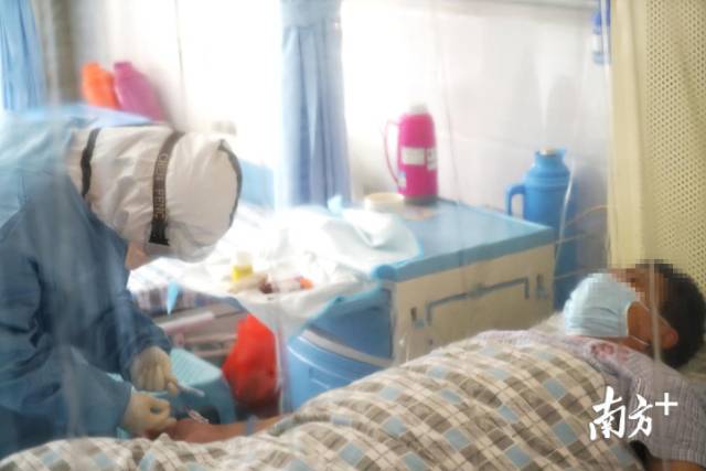 隔离病房内,护士在为患者吴源(化名)抽血采样。刘栋铭 摄