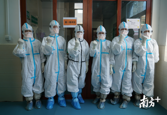 在进入隔离病房的缓冲区前,护士们给自己打气。刘栋铭 摄