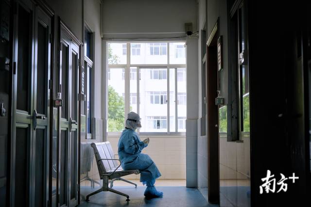护士杨海燕坐在隔离病房外走廊的座椅上,等候进病房换针水。刘栋铭 摄