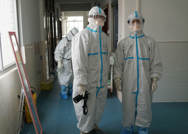 朱志波小心翼翼地脱防护服,杨海燕在一旁协助他每个环节规范到位。刘栋铭 摄