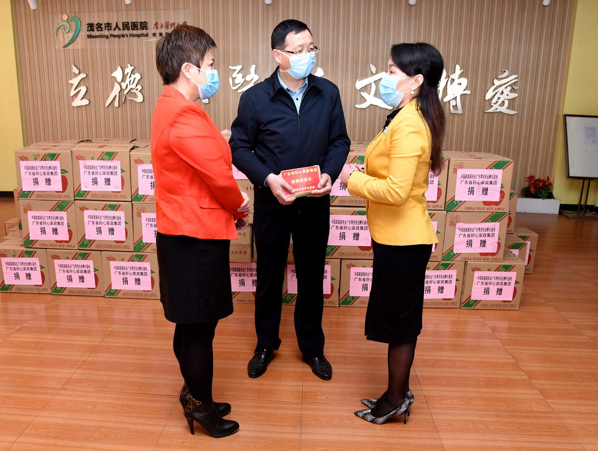 今天上午,茂名市好心家政集团向我院捐赠一次性医用口罩2500个、苹果100箱,为我院驰援湖北的医护人员家庭捐赠居家保洁卡,免费提供家庭保洁服务直至疫情完全结束,为驰援湖北医护人员解决“后顾之忧”,用实际行动支持一线抗疫医务人员。茂名市政协副主席、市委组织部副部长、市人力资源社会保障局党组书记、局长董晓璐,我院院长陈纯波出席捐赠仪式。(林显滨)