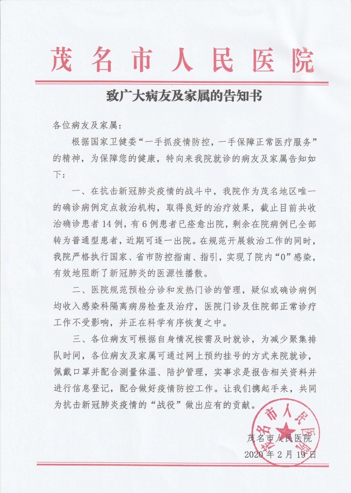 致广大病友及家属的告知书-疫情防控 党员风采-不忘初心 牢记使命-专题-茂名市人民医院|广东医科大学茂名临床医学院