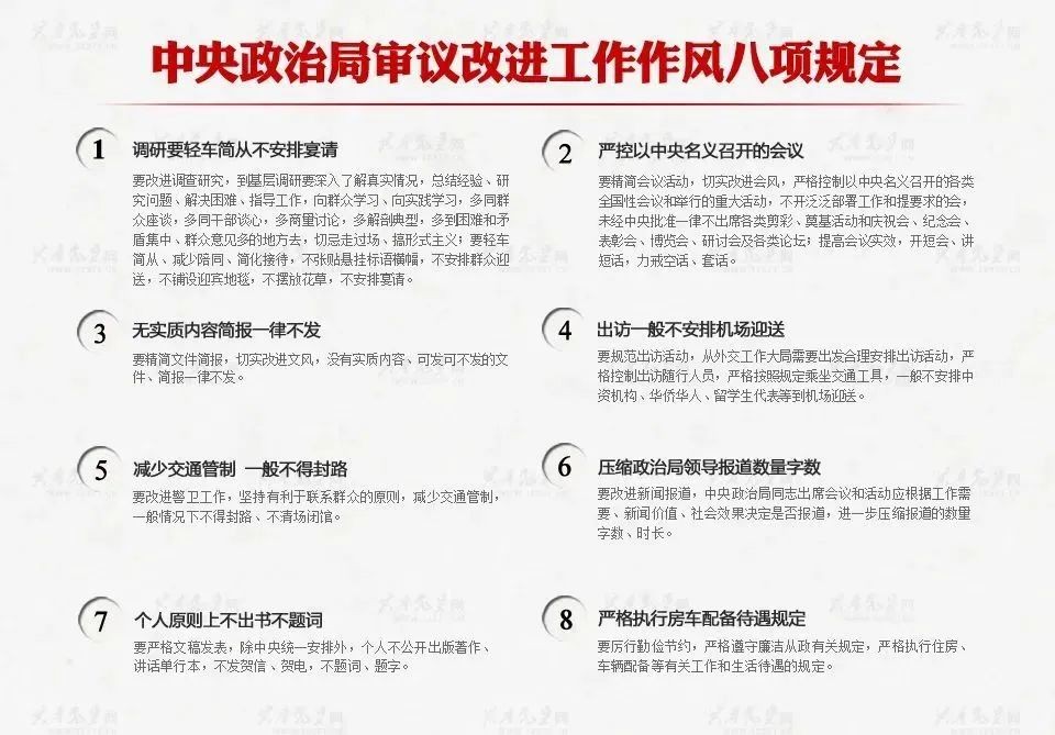 2012年12月4日,中央政治局召开会议,审议通过了《十八届中央政治局关于改进工作作风、密切联系群众的八项规定》,因为其主要内容有八项,所以简称为“中央八项规定”,内容包括改进调查研究、精简会议活动、精简文件简报、规范出访活动、改进警卫工作、改进新闻报道、严格文稿发表、厉行勤俭节约等8个方面。