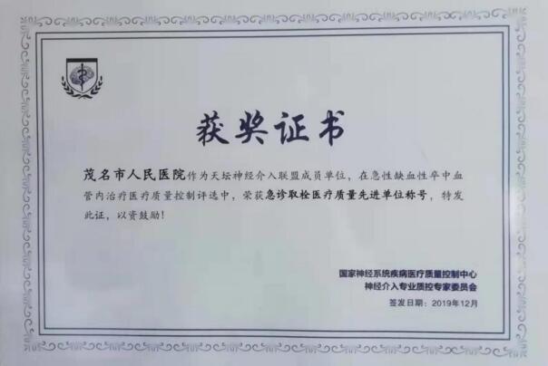 2018年4月,茂名市卒中医疗质量控制中心正式成立,我院是茂名地区唯一一家高级卒中中心,也是茂名市卒中质控中心主任单位。我院作为广东省高水平建设医院,成立本院的卒中质控中心,发挥多科室协作能力,优化诊治流程和绿色通道,不断提高溶栓率和取栓率。国家卫健委每月都对全国高级卒中中心300强医疗单位进行排名,我院卒中中心在血管内治疗技术、颈动脉支架置入术、静脉溶栓等方面排名均名列国内前列。