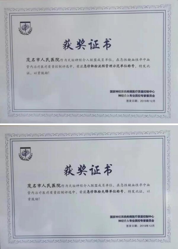 本次我院荣获急诊取栓先锋单位、急诊取栓流程管理示范单位及急诊取栓医疗质量先进单位称号,是群众对医院卒中救治工作成果的一个充分肯定,医院将进一步推进卒中中心建设,发展高水平专科,打造医院品牌学科,努力实现医学登峰,建设高水平医院,造福茂名地区广大市民。