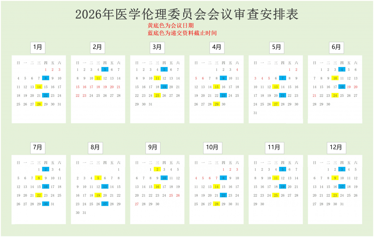 现公布我院医学伦理委员会2026年度伦理审查会议时间安排,请密切关注会议日期及资料递交截止日期,合理安排资料递交时间。