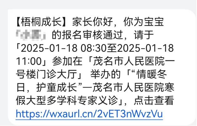 有意向参加生长发育义诊项目的家长请通过微信小程序“梧桐成长”(下附二维码)报名。只扫码但没有如实填写信息的,可能导致无法正常收到生长发育报告以及义诊通知。家长们填写信息后请认真阅读报告,先了解孩子的生长发育情况,义诊团队将根据名单筛选并通知,请报名的家长们留意短信。收到通知的家长请准时带孩子参加活动。