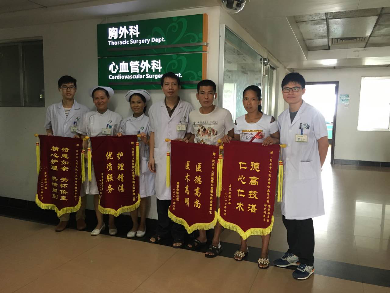 近日,蔡女士及其家属带着锦旗来到茂名市人民医院心血管外科,向该科全体医护人员表达了最诚挚的谢意和感激之情。感谢心血管外科的医生让她的心脏重生,不再忍受疼痛的煎熬;感谢心血管外科的护士给予她细致优质的护理,让她早日康复出院。