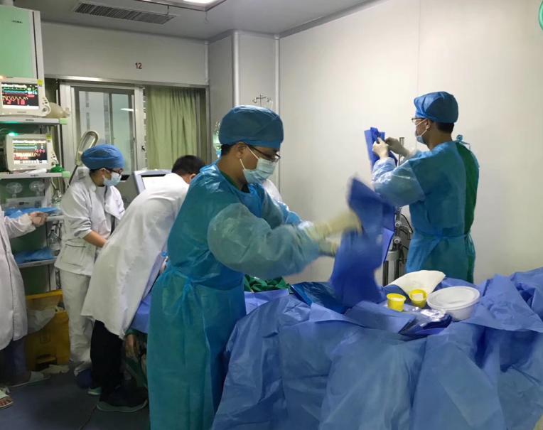 今年62岁的李伯是一名农民,一个多月前曾突然出现胸痛,胸痛难以忍受的症状,当时察觉身体不适的李伯立刻拨打120,于当日凌晨6时被送至我院急诊科。急诊科医生为李伯做了初步检查后,考虑为急性心肌梗死,正准备进行进一步治疗时,李伯突然心脏停跳,此时急诊科的医护人员迅速投入到抢救中。急诊科谭博医生第一时间为李伯建立人工气道,予以机械通气;心内科林琳医生、重症医学科李辉华医生、余健医生也轮流上阵,给予患者高质量的心肺复苏治疗。在经过20分钟的心肺复苏后,李伯在短暂的恢复心跳之后,心脏再次停跳,医护人员再次给予心肺复苏抢救。第二次心肺复苏了15分钟后,李伯的心跳仍然不能恢复,CPR团队当机立断,决定启动ECPR程序。
