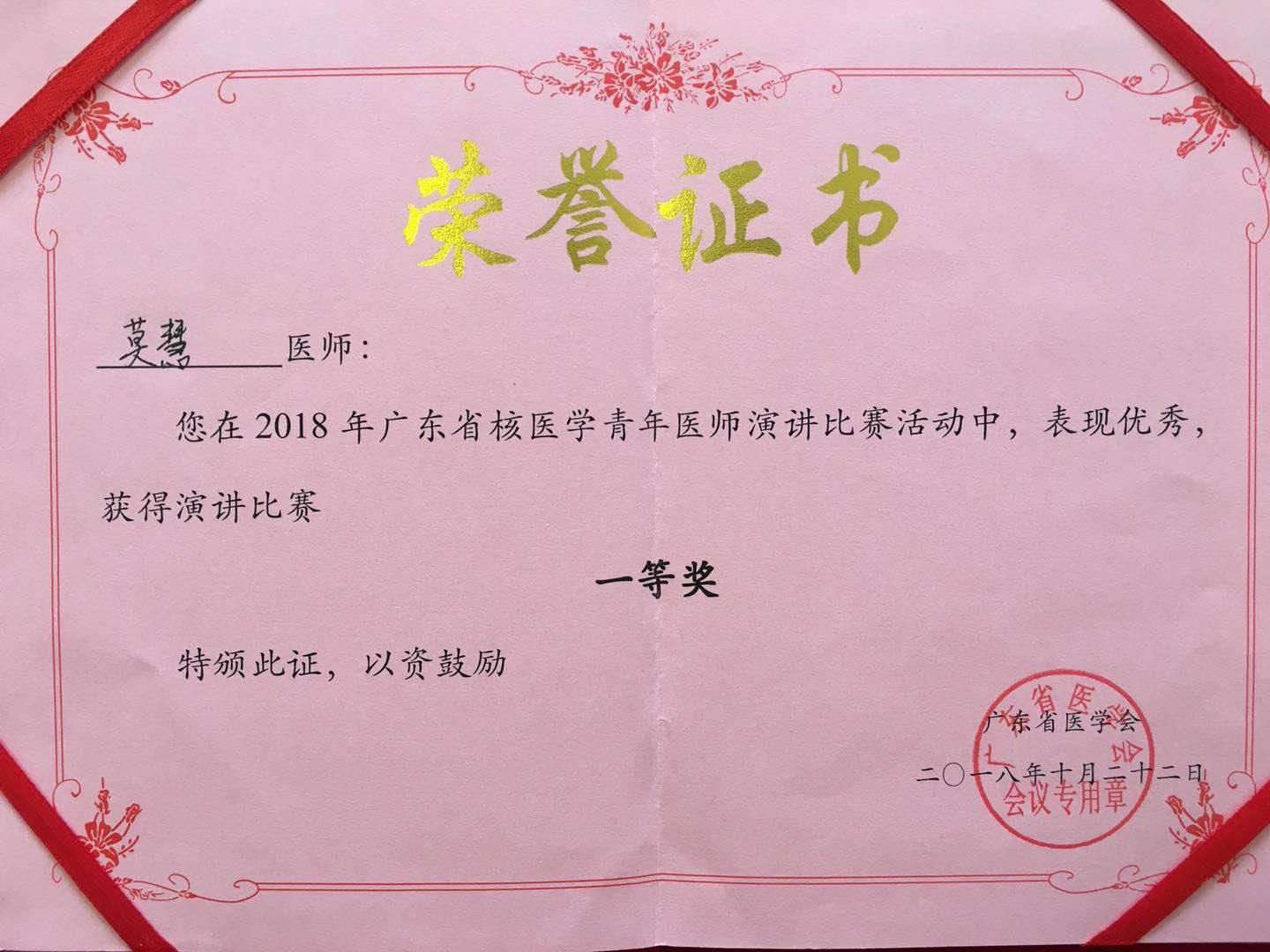 近日,由广东省医学会核医学分会主办,暨南大学附属第一医院承办、广东省医学会核医学分会青年委员会协办的2018年广东省核医学青年医师演讲比赛成功举行。我院核医学科专家莫慧凭借过硬的专业知识、出色的演讲技巧以及稳健的台风荣获一等奖。