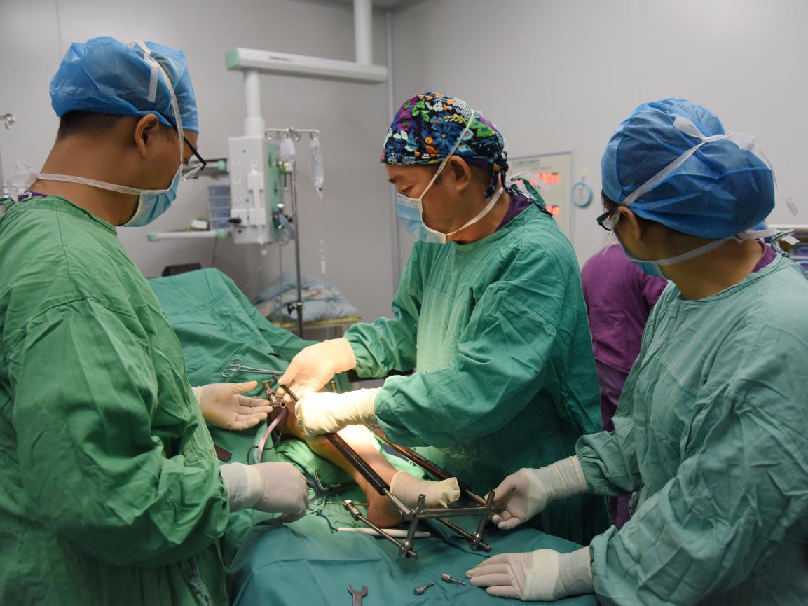 原来42岁的患者唐某在十年前曾因外伤导致左小腿开放性骨折,当时在省内外多间医院接受手术治疗,术后唐叔的左侧胫腓骨出现骨不连及慢性骨髓炎的症状,平时的行走活动都受到了很大限制。一年前,唐伯的左小腿在活动频繁的时候还会反复出现渗液流脓,严重困扰生活及工作。今年8月份,在家人的陪同下,唐某来到了我院创伤骨科寻求治疗,入院后医生为患者做详细检查后,明确诊断为“左胫腓骨慢性骨髓炎并假关节形成”。为了挽救患肢,医生与患者及其家属进行沟通并征得同意后,对唐某的患肢实施了牵引下左小腿胫腓骨骨髓炎病灶清除、思迪骨粉置入术以及骨搬运术等一系列手术治疗。经过近三个小时的手术,手术顺利完成,患者生命体征平稳,保肢成功,目前已开始漫长的骨搬运。