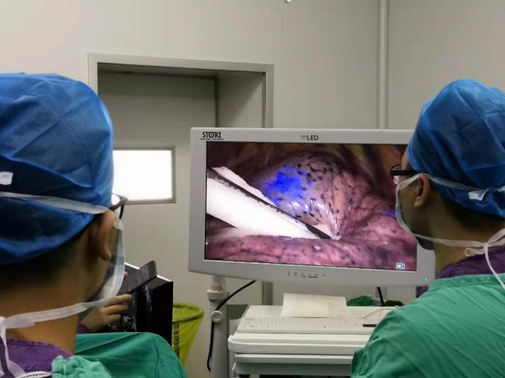据胸外科主任黄健介绍,电磁导航支气管镜技术采用三维CT重建技术和电磁定位原理,可引导支气管镜及电磁定位导管准确到达肺内病变所在,建立工作管道,以便准确对病灶进行标记、活检或微创介入治疗,且经自然腔道导入无体表损伤。通过利用导航系统进行荧光标记,精准确定病灶位置,使病变质地与正常组织质地相区分,提高了肺部肿瘤手术的安全性和准确性,减少不必要创伤的同时,为患者完整切除肺部结节并提供准确的病理诊断。