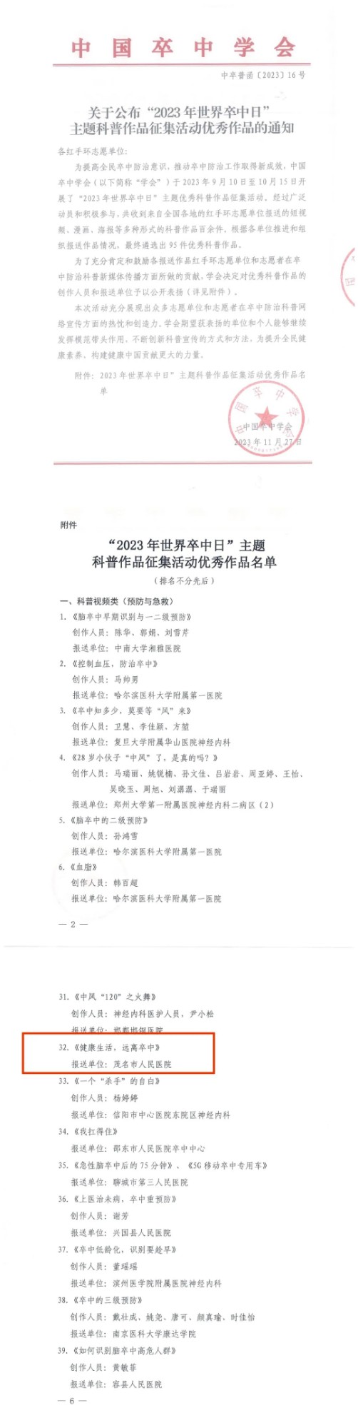 茂医这项卒中科普创作,获全国优秀!