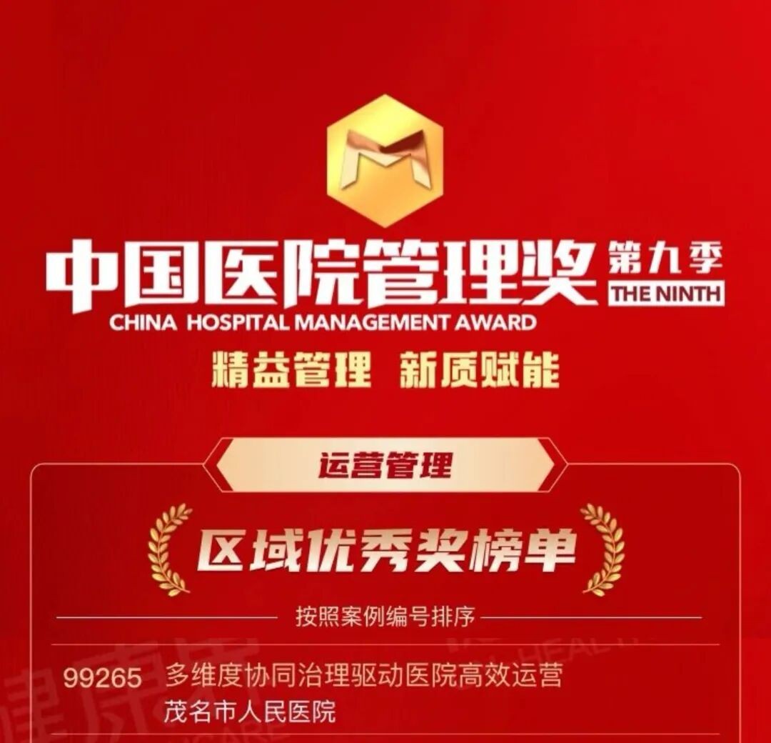 近日,健康界联合国内多家医院管理研究机构正式公布第九季中国医院管理奖区域优秀奖榜单。由茂名市人民医院(下称:茂医)发展规划部牵头申报的《多维度协同治理驱动医院高效运营》案例,经过全国1924位专家评委的多轮严格评审,从27个省份、442家医疗机构的2410个优秀案例中脱颖而出,荣获“区域优秀奖”。