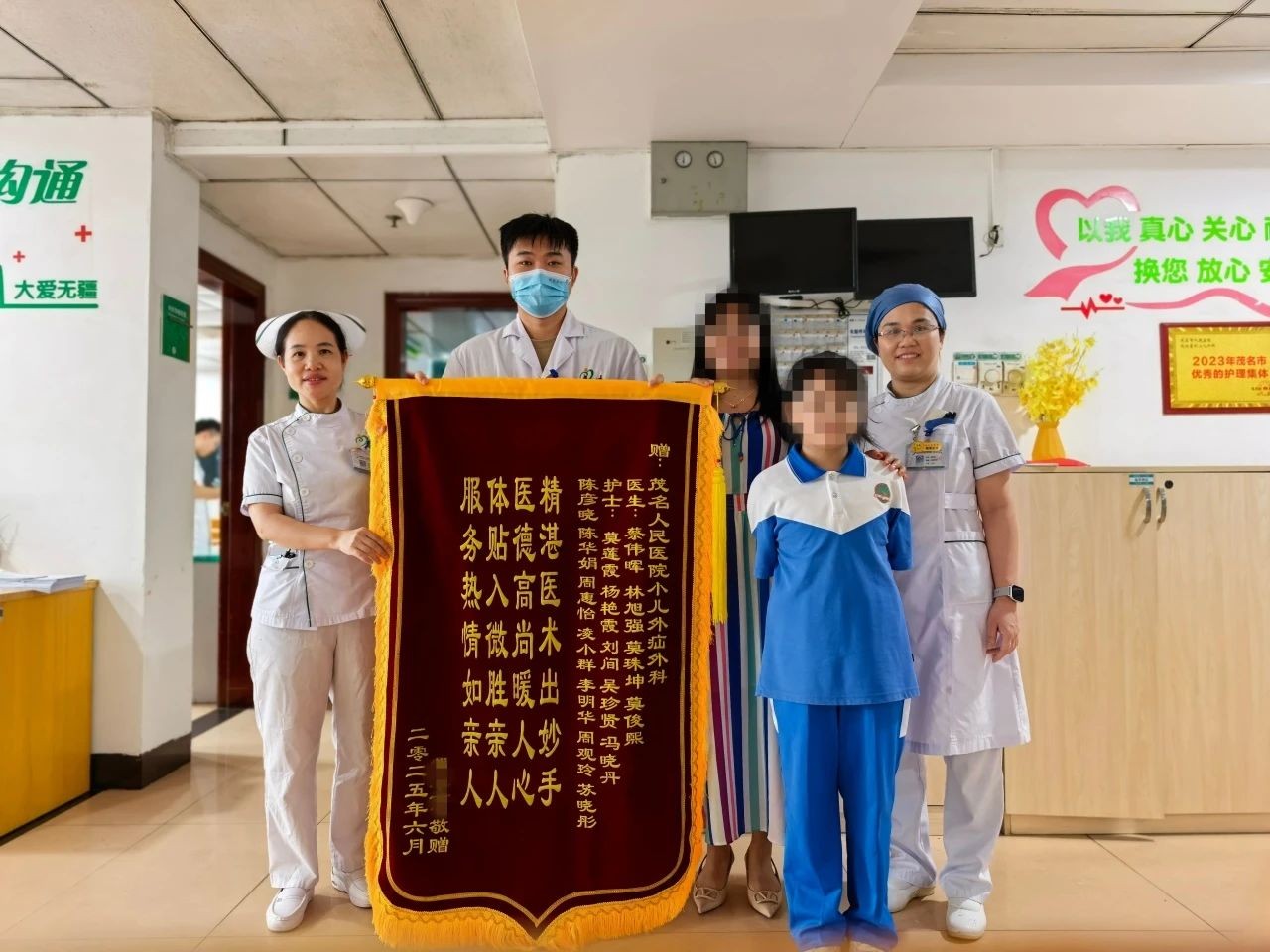 再次来到茂名市人民医院小儿外/疝外科的小涵(化名),目光落在那张熟悉的3号病床上,床单被褥平整如新,仿佛两周前那个蜷缩在床上疼得打滚、发抖的小女孩不是她。这次,她不是来看病的,而是专门来感谢这里的医生和护士们。小涵的家长也陪伴在旁,眼中满是动容与感激。他们手里紧紧拿着一面写有“医德高尚暖人心,医术精湛传四方”的锦旗,郑重地送给了小儿外/疝外科的医护团队。