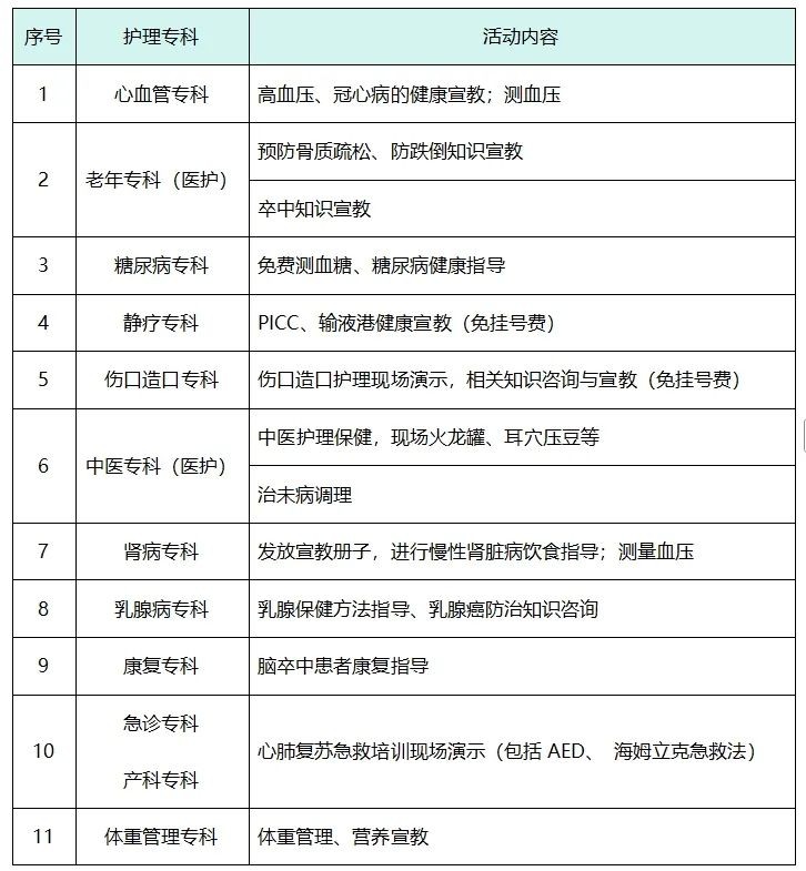 心血管专科、老年专科、糖尿病专科、静疗专科、伤口造口专科、中医专科、肾病专科、乳腺病专科、康复专科、急诊专科、产科专科、体重管理专科