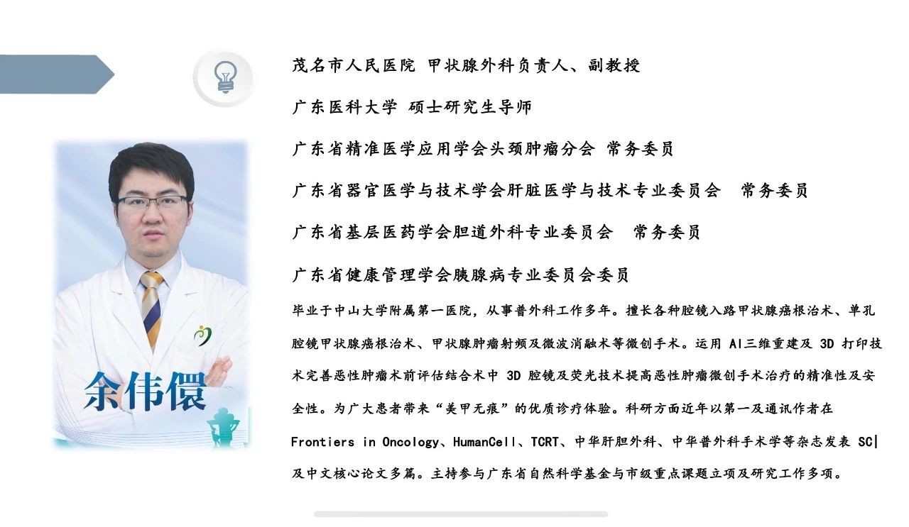茂名市人民医院余伟儇副教授团队擅长各种腔镜入路甲状腺癌根治术、单孔腔镜甲状腺癌根治术、甲状腺肿瘤射频及微波消融术等微创手术。运用 AI三维重建及 3D 打印技术完善恶性肿瘤术前评估结合术中 3D 腔镜及荧光技术提高恶性肿瘤微创手术治疗的精准性及安全性。为广大患者带来“美甲无痕”的优质诊疗体验。
