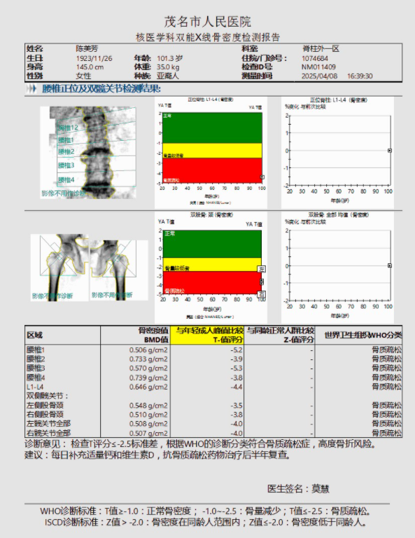这天,101岁的陈奶奶(化名)在家人的搀扶下来到茂名市人民医院脊柱外一区诊室。“近一周来腰背部剧痛难忍,翻身和坐起都异常痛苦。她冠心病、高血压病史,长期服药控制。”家人向接诊医师描述病情,担心不已。