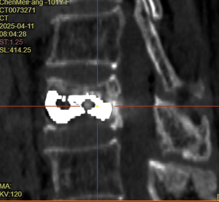 ▲术后CT显示:骨水泥完美填充,椎体高度部分恢复,力学重建成功