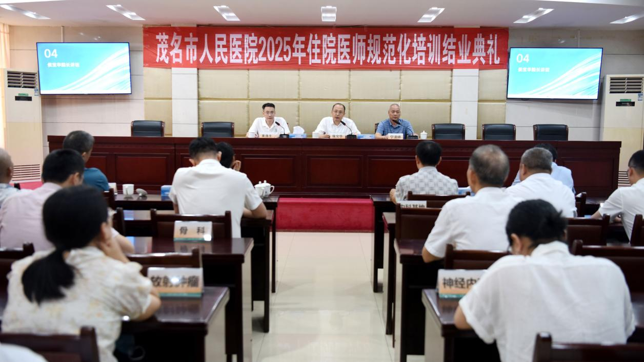 2025年7月21日下午,2025年茂名市人民医院住院医师规范化培训(以下简称“住培”)结业典礼在我院5号楼4楼会议室隆重举行。市卫健局副局长宁凌峰、院长侯宝华亲临现场并作重要讲话,医院住培专业基地主任、教学主任、基地秘书、2022级住培医师以及教学培训部全体人员共同参与,共同见证这一意义非凡的时刻,典礼由副院长黄逸生主持。
