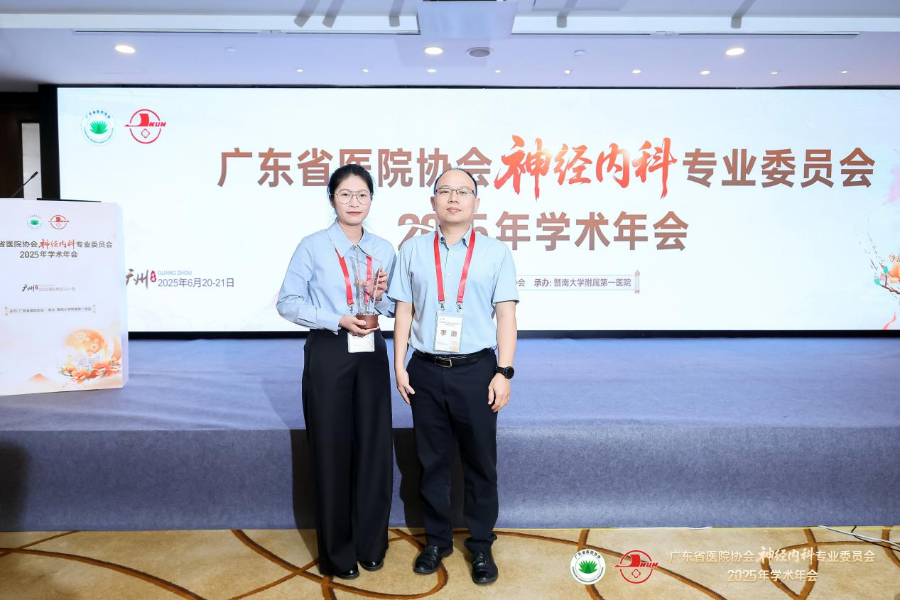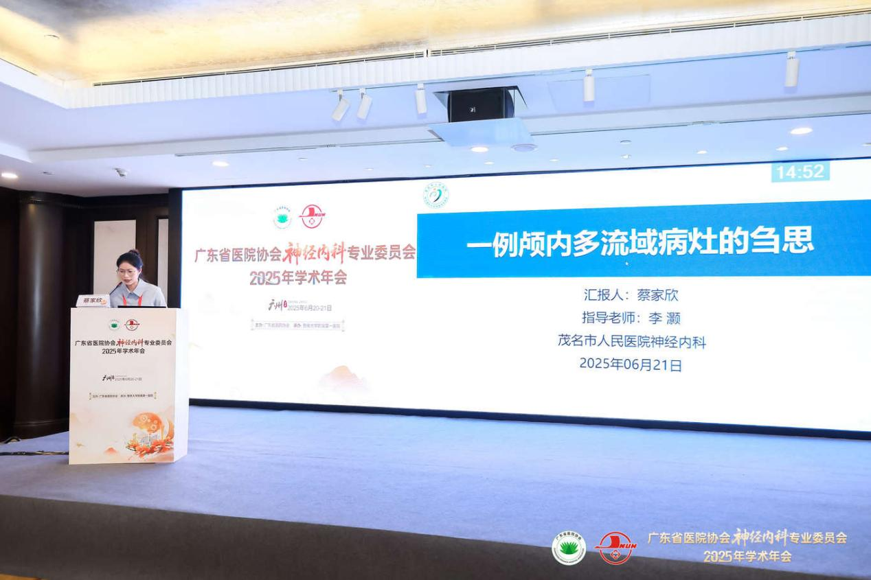 6月20-21日,由广东省医院协会主办,暨南大学附属第一医院承办的“广东省医院协会神经内科专业委员会2025年学术年会”在广州举办。此次年会群贤毕至,广东省多家医疗机构神经内科领域的专家学者汇聚一堂,交流、探索神经内科前沿成果,共襄学术盛会。病例大赛作为年会的“重头戏”,为中青年医师提供了一展风采的舞台,由茂名市人民医院神经内科二区副主任、医学博士李灏指导,2023级南方医科大学硕士研究生蔡家欣作为代表演讲的“一例颅内多流域病灶的刍思”获三等奖。