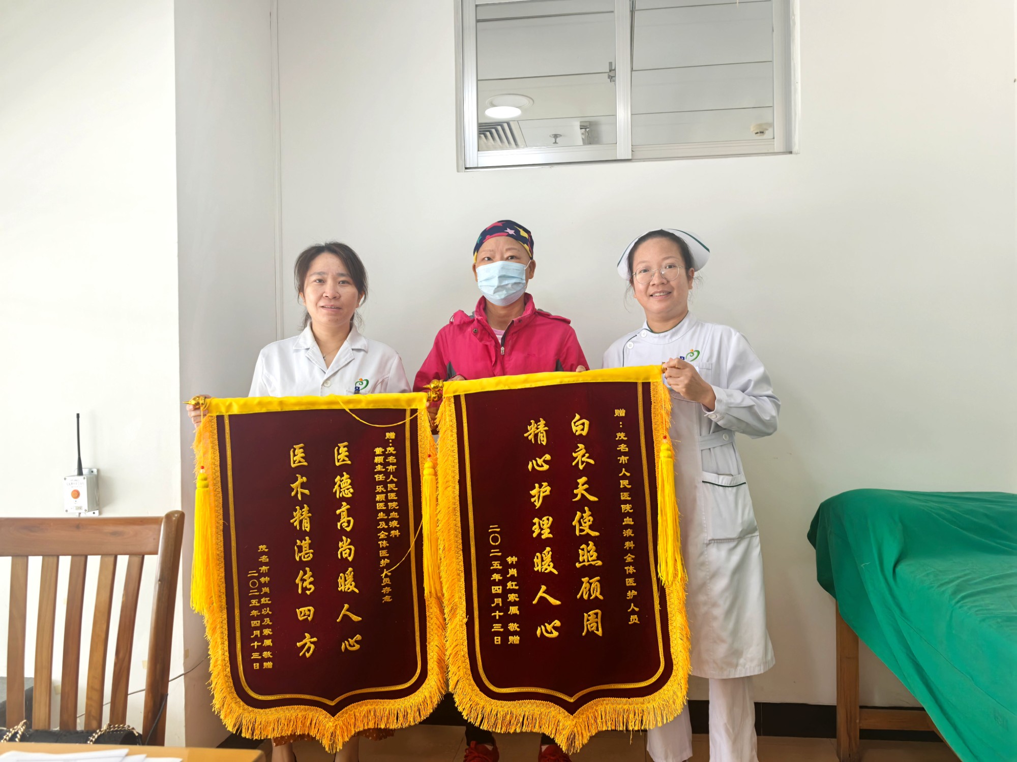 随着时间的推移,钟女士的病情一天天好转。经过一系列的复查和检测,骨髓的检查结果显示了令人振奋的消息:钟女士已经达到了完全缓解的状态,这意味着她可以出院了。在回院复查时,钟女士和家属将两面绣着 “医德高尚暖人心 医术精湛传四方”“白衣天使照顾周 精心护理暖人心”字样的锦旗送到茂名市人民医院血液风湿免疫科。钟女士紧紧握住董颖教授的手说道:“幸而这次有你们,我才能闯过来,这份恩情我永生难忘。” 董颖教授微笑着回应道:“看到你康复,就是对我们最大的回报。要注意身体,定期复查,有什么问题随时联系我们。” 这温馨的一幕,为这场艰难的 “生命保卫战” 画上了圆满的句号,也见证了医患之间深厚的情谊。