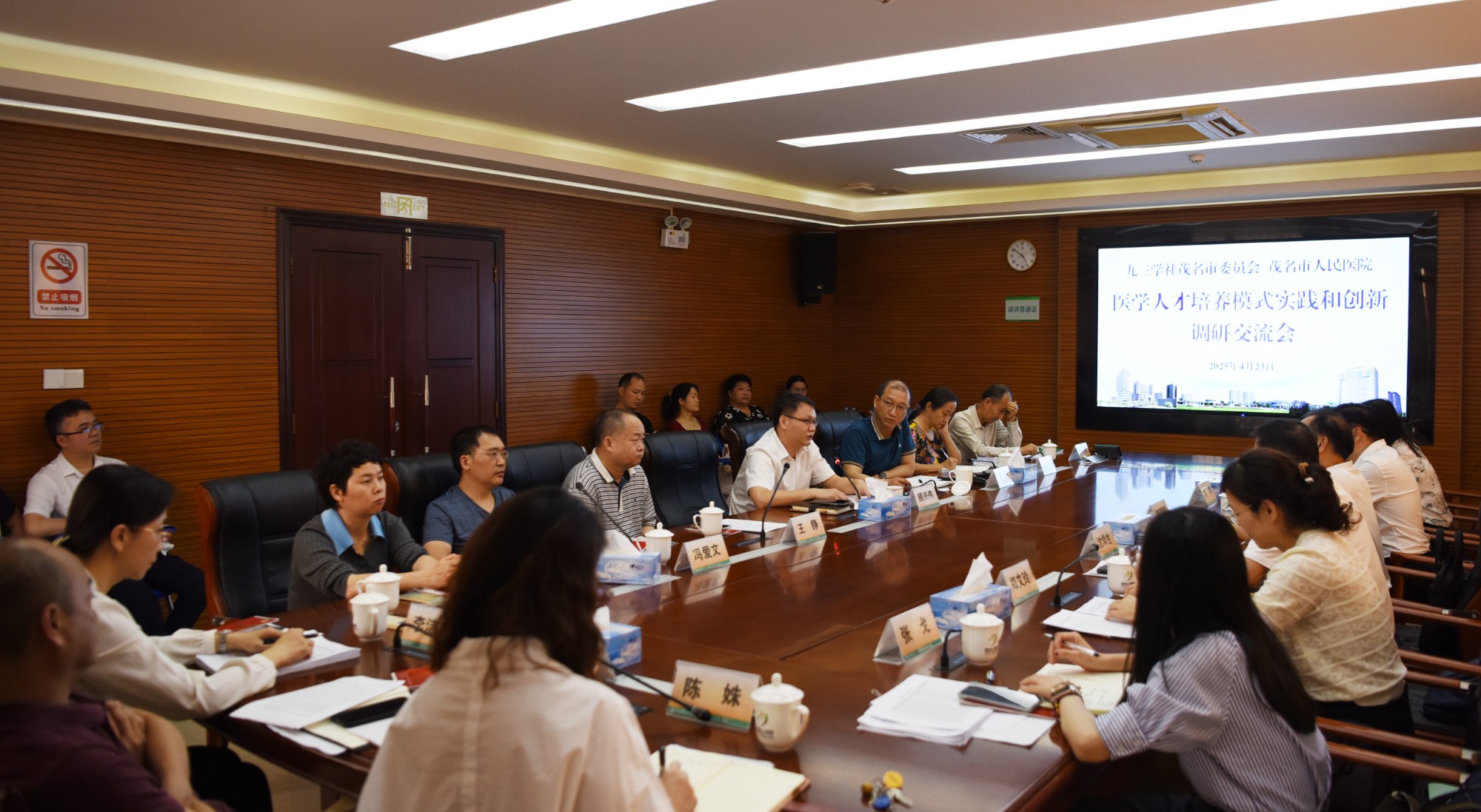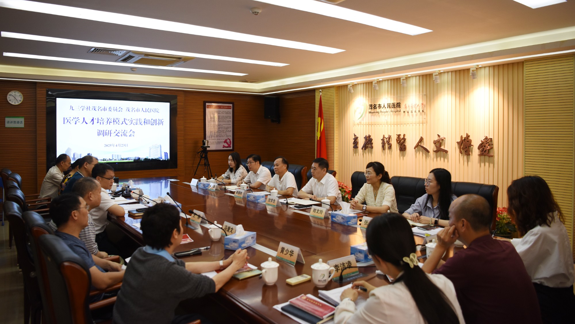 4月23日,九三学社茂名市委员会与茂名市人民医院以“医学人才培养模式实践和创新”为主题在医院5号楼五楼会议室展开深入调研交流,聚焦医学人才创新培养机制与学科建设协同发展。九三学社茂名市委员会原主委、茂名市政协原副主席崔锡明,主委沈学生,副主委郑文玲、梁谋,医院党委书记顾兴伟,副院长黄健,九三学社茂名市人民医院支社社员代表以及相关部门负责人共计20余人参加。