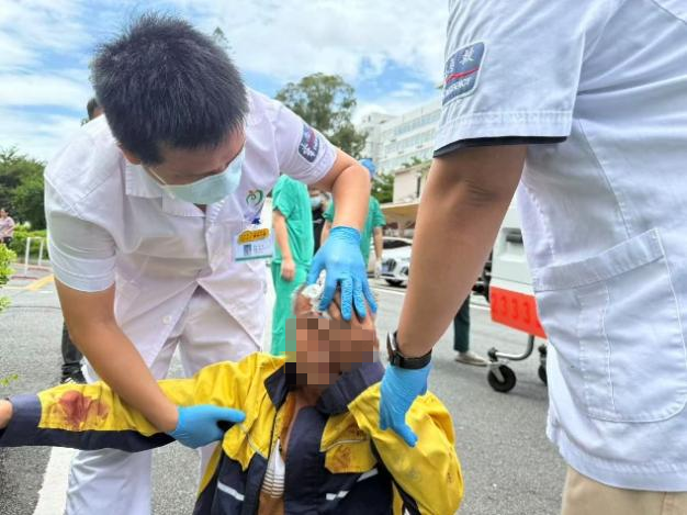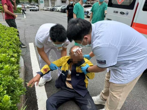 来到现场后,陈浩然一行发现一名老伯卧倒在地上,额头有个伤口正在流血,立即对老人情况进行初步评估同时拨打院内急救电话。经现场初步判断,老人为突发一过性晕厥,意识不清,但无心脏呼吸骤停等致命迹象。几分钟后,医院急诊救护单元人员赶到,大家共同调整患者体位,将其平稳转运上救护车至急救中心接受后续观察与治疗,期间,陈浩然等与急诊科医护人员对患者情况进行了衔接,帮助急诊团队快速掌握病情。