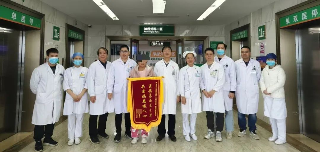 术后,神经外科一区医护团队为李女士制定了个性化的康复方案,经过术后3天治疗,李女士的病情稳定,头痛症状明显缓解,各项生命体征平稳,顺利办理出院。李女士满怀感激之情,为表达对医护人员辛勤付出和专业精神的敬意,她特地送上了一面锦旗,上面写着“医德高尚医术精,关爱病患暖人心"。这面锦旗不仅是对医护人员精湛医术的肯定,更是对他们无私奉献精神的最好诠释。