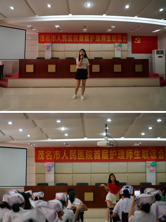 本次联谊会节目丰富,现场气氛热烈,高潮迭起,同学们以青春欢乐,可爱温馨为主旋律,奉上了手语大合唱、独舞、独唱、诗朗诵等精彩的表演,展现了学生朝气蓬勃的精神面貌,博得了阵阵喝彩。随后,同学们与带教老师说说心里话的环节将师生联谊会推向高潮。藉着此次师生联谊会的契机,来自珠海卫校的徐玲玲、梁雪琦;茂名健康学院大专班杨宇玲;湛江中医学校汪文怡;茂名健康学院中专班吴旺娣、梁洪淼同学朗读了她们写给老师的感谢信,分享了这几个月以来实习的感受,从开始的茫然无措到现在的坚定自信的实习状态,特别感谢带教老的悉心教导。带教老师代表综合科张超丽老师、康复科邓美婷老师、心内一科李丽珠老师医技神经内一科的萧彩杰老师分别讲了对实习同学的期盼及鼓励。“师恩如海,无法估量,人生因有恩师而酣畅”,现在的同学们唯用鞠躬感谢带教老师的倾囊相授,以一张贺卡送上诚挚的祝福。