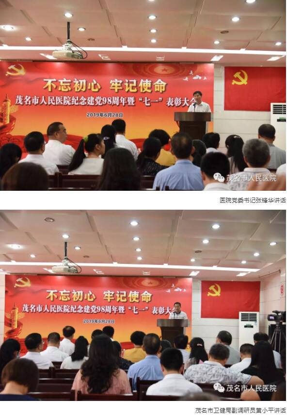 6月28日下午,我院召开庆祝建党98周年暨“七一”表彰大会,表彰为医院改革发展作出贡献的先进党支部、先进党小组、优秀党务工作者、优秀党员。茂名市卫健局党组成员、副调研员黄小平,茂名市卫健局机关党委专职副书记吴祖荣,医院党委书记张锋华、副院长江波、党委副书记柯木祥、总会计师黄勇红出席,全体党员、中层干部200余人参加大会。