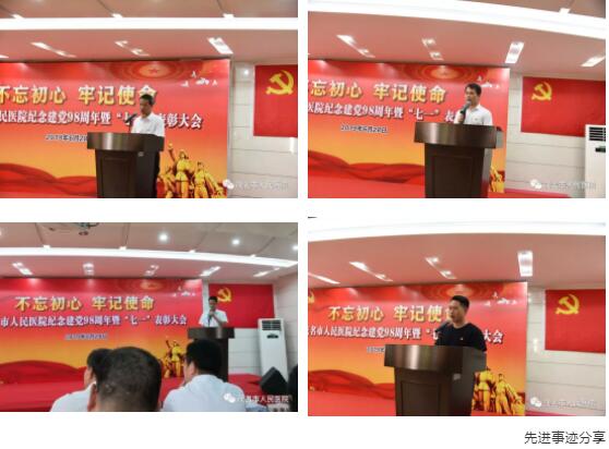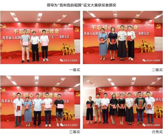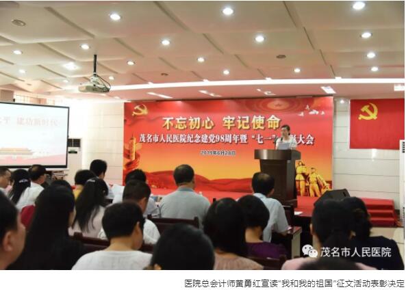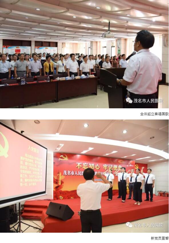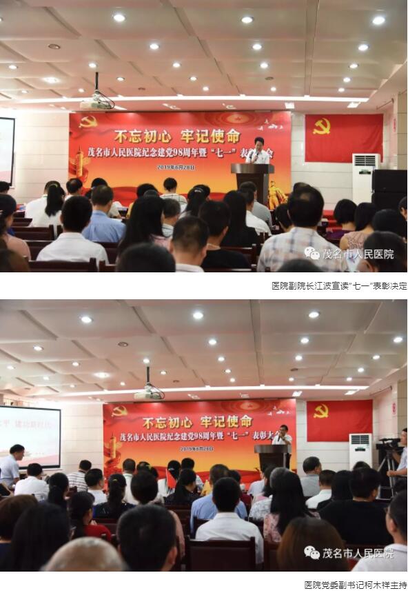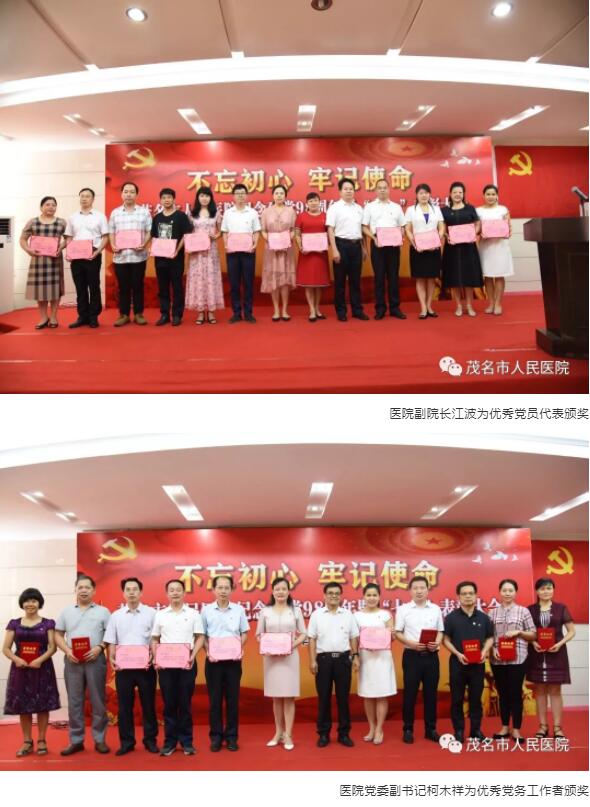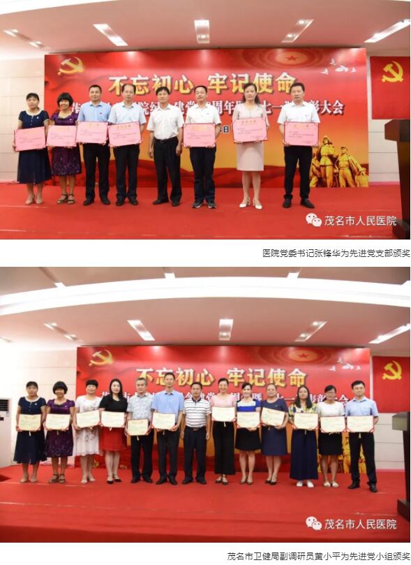 表彰会上,柯木祥副书记作了2018年医院党建工作报告,江波副院长宣读了医院党委《关于表彰先进党支部、先进党小组、优秀共产党员和优秀党务工作者的决定》,黄勇红总会计师宣读了医院党委《“我和我的祖国”征文活动表彰决定》。茂名市卫健局以及医院领导向受表彰的先进集体和优秀个人颁发荣誉证书。随后,4名优秀党员代表分享了他们的先进事迹,在党员中引起了强烈的反响。新党员在柯木祥副书记的带领下郑重宣誓。