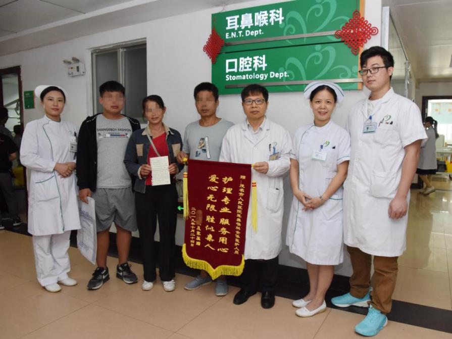 近日,在茂名市人民医院耳鼻喉科病房上演了温情一幕。一名顺利康复出院的手术患者偕同家人将一面题有“护理专业 服务用心 爱心无限 胜似亲人”的锦旗和一封手写的感谢信送到医护人员手中,并再三感谢该科医护团队对其在住院期间的精心治疗和细致用心的照顾。