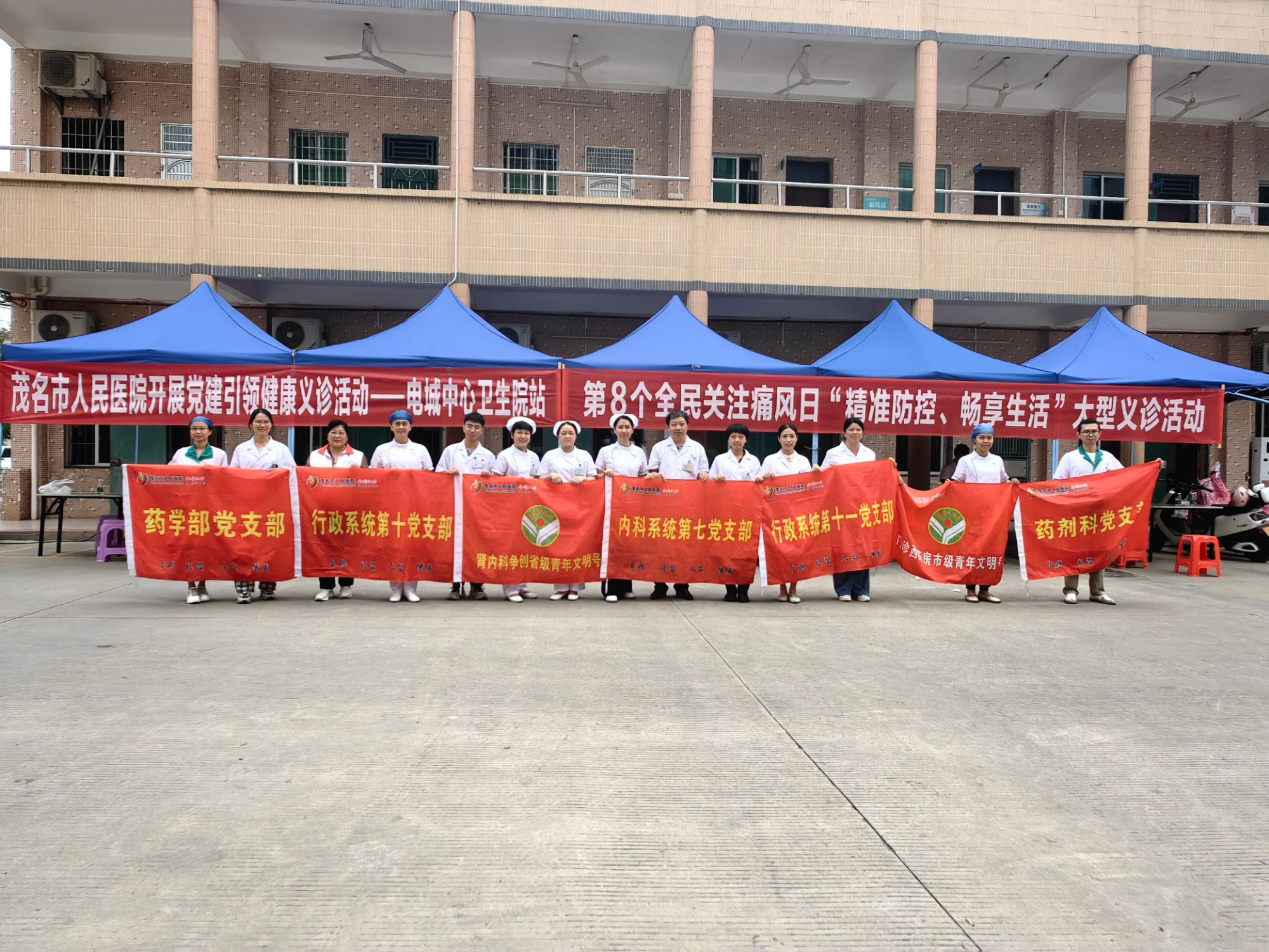 每年的4月20日是世界痛风日,同时也是囯内“全民关注痛风日”。为进一步落实“健康中国”战略目标以及茂名市人民医院“党建+”健康服务的工作部署,响应“世界痛风日”主题号召,提高基层群众对高尿酸血症及痛风的重视程度,4月20日,茂名市人民医院内科系统第七党支部联合营养科、药剂科、护理部,组织了16名党员医护人员前往电白区电城中心卫生院开展“精准防控 畅享生活”世界痛风日主题义诊活动。