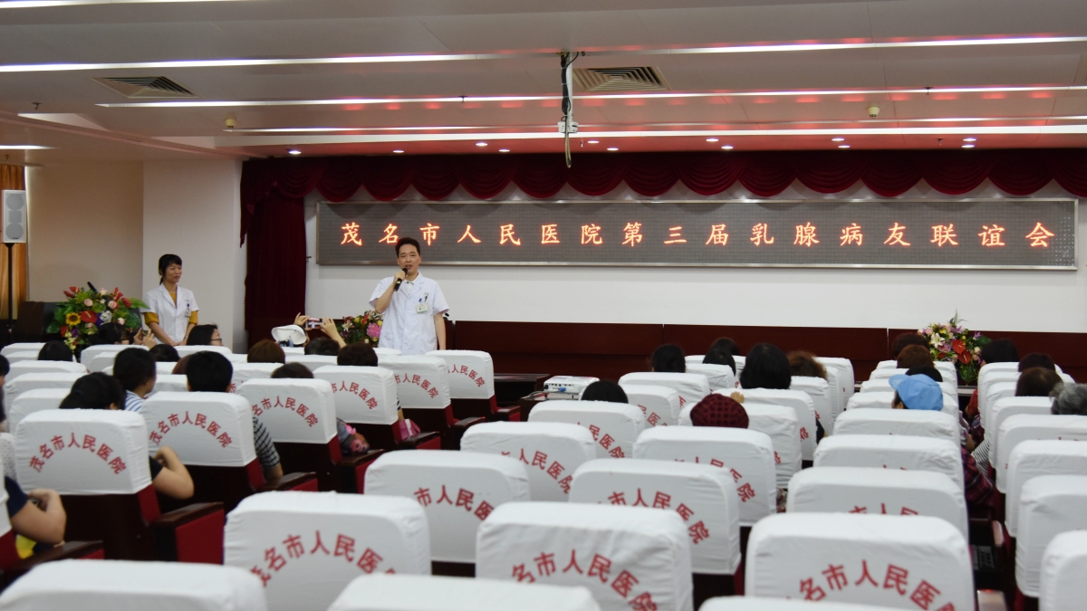 百乳腺癌患者齐聚 相互鼓励增进交流 2018-05-05 00:00 我院举办乳腺癌患者联谊会 5月5日上午,我院乳腺病科于医院一号楼23楼会议室举办乳腺癌患者联谊会,该科医务人员与来自茂名地区的百余名乳腺癌患者齐聚一堂,通过为患者普及知识及开展一系列互动游戏,为到场的乳腺癌患者们搭建了一个交流平台。 (文/图 朱昭)