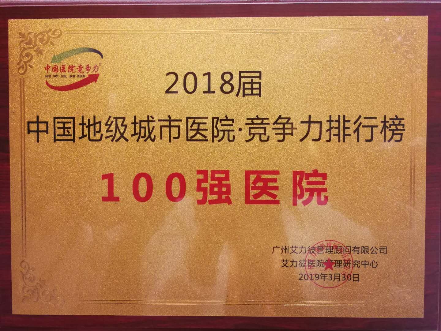 近日,由香港艾力彼医院管理研究中心主办的2019年中国医院竞争力大会在广州举行。会上发布了《医院蓝皮书:中国医院竞争力报告(2018-2019)》,并公布了一系列医院排行榜单,在中国医院竞争力排行榜中,我院荣获“2018届地级城市医院100强”殊荣,且连续第三年进入中国医院竞争力·地级城市医院100强排行榜。