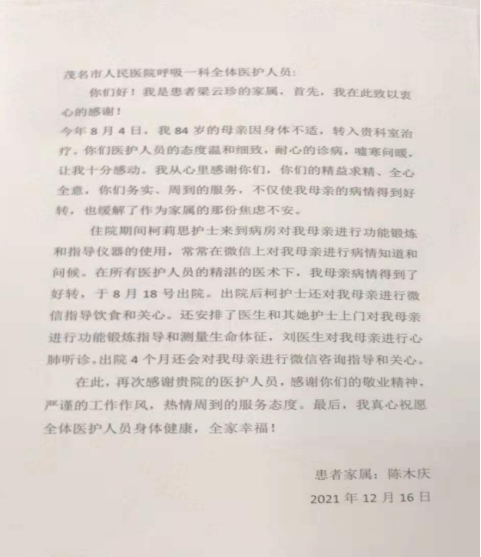 冬日惠风徐徐送,丝丝入扣暖心头。12月16日,茂名市人民医院呼吸一科接到一封来自患者梁姨家属的表扬信,让安静的病房瞬间感受到温煦的荣光。